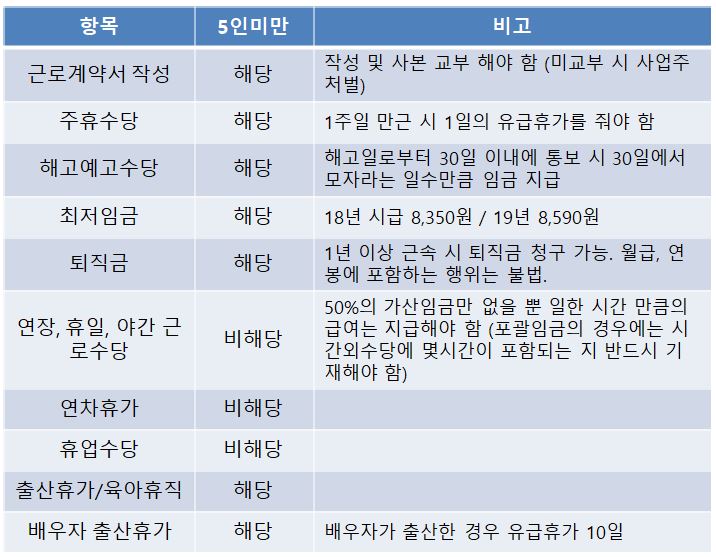 위에서 비해당이라고 적힌 부분이 5인 미만 사업장에는 적용되지 않는 부분입니다. 당연히 해당이라고 되어 있는 부분은 적용 받을 수 있다는 말입니다. 예를 들면 5인 미만 사업장에서도 1주일을 만근하면 주휴수당을 지급해야 한다는 것입니다.