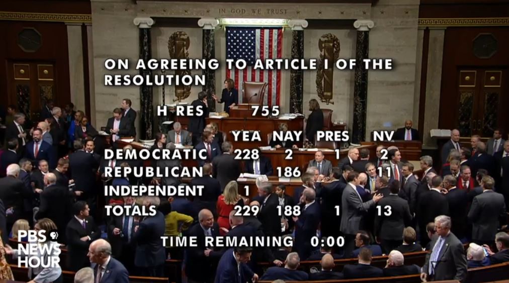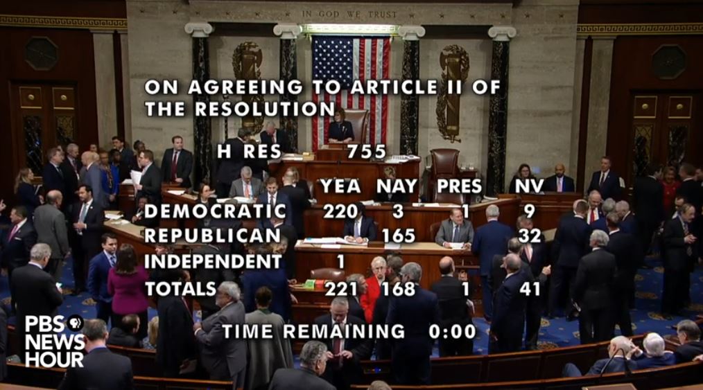 미 하원의회(의장: 낸시 펠로시, 민주당)는 장시간의 치열한 토론과 휴정을 반복한 끝에 표결을 거쳐 트럼프 대통령에 대한 탄핵안을 가결시켰습니다.