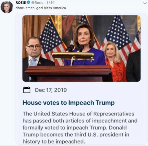 어쨌든 이번 미 하원의 탄핵 결정으로 트럼프 탄핵의 최종 결정은 미국 상원의 손으로 넘어 가게 되었습니다.