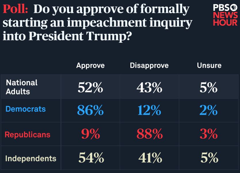 위의 그림은 지난 10월 조사된 트럼프 탄핵 소추에 대한 여론조사 결과입니다. 전국적으로 52%가 찬성하고 43% 반대하고 있음을 알 수 있습니다.