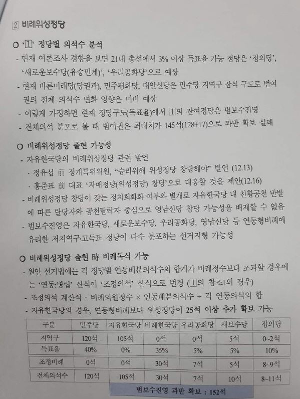 김재원 의원이 공개한 문건에 따르면 현재 계류 중인 선거법이 통과될 경우, 비례 한국당을 포함한 한국당이 제 1당으로 올라서고, 우리공화당, 새보수당 등 범보수 진영의 의석 수가 152석에 이르러 전체 의석 과반수를 차지하게 될 것이라는 전망이 담겨져 충격을 주고 있습니다.
