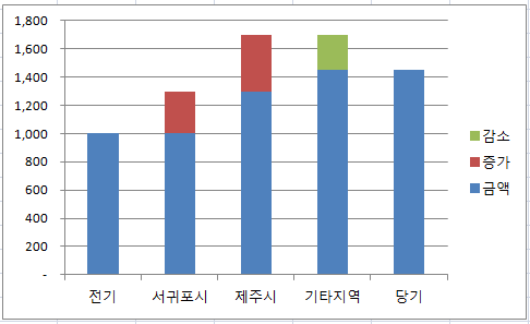 드디어 차트가 완성되었습니다. 전기에 매출이 1,000이었는데, 서귀포에서 300이 늘고, 제주에서 400이 늘고 기타 지역에서 250이 감소해서 당기 매출이 1,450이 되었다는 것이 차트로 한 눈에 드러납니다.