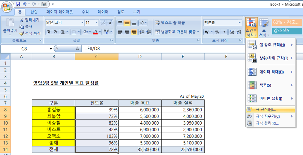 만약 여기서 전체 진도율 보다 낮은 사람의 숫자는 다르게 표시되게 하고 싶다고 생각하신다면, 규칙관리-> 새규칙을 추가해서 평균이하의 숫자는 다른 색깔로 나타나게끔 바꿀 수도 있습니다.