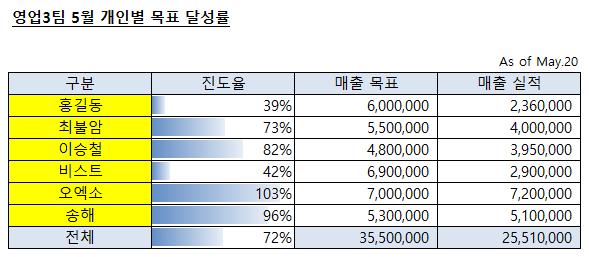 아래의 테이블은 예시로 어느 회사 영업3팀의 개인별 5월 매출 실적을 나타낸 것입니다.