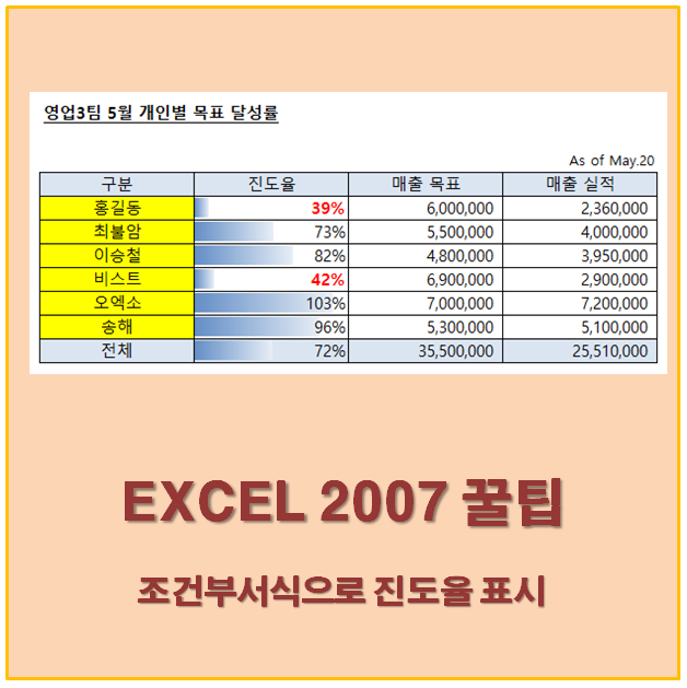5월 20일 현재 개인별 목표 달성률(진도율)을 %로 표시한 내용인데, 진도율 셀을 보시면 각 셀마다 진도율 만큼 채우기 표시가 되어 있습니다. 따라서, 세부 숫자를 보지 않더라도 가로막대그래프만 보면 현재 누가 부진하고 누가 잘 하고 있는 지 한 눈에 알 수 있습니다.