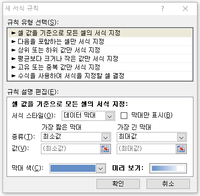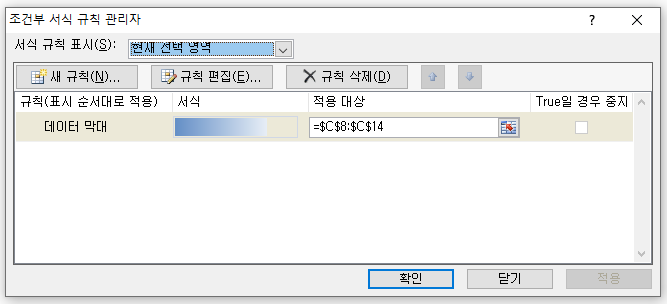 먼저 조건부서식을 적용할 구간(C8:C14)을 선택한 다음 홈->조건부서식->새규칙을 클릭합니다. 그리고는 아래와 같이 "▶셀 값을 기준으로 모든 셀의 서식 지정" 을 선택하고 서식스타일을 "데이터 막대"로 선택합니다.